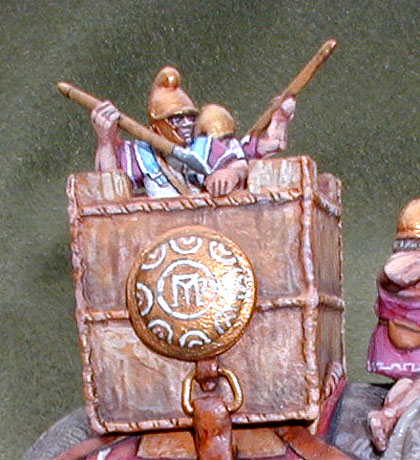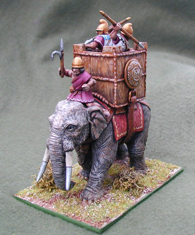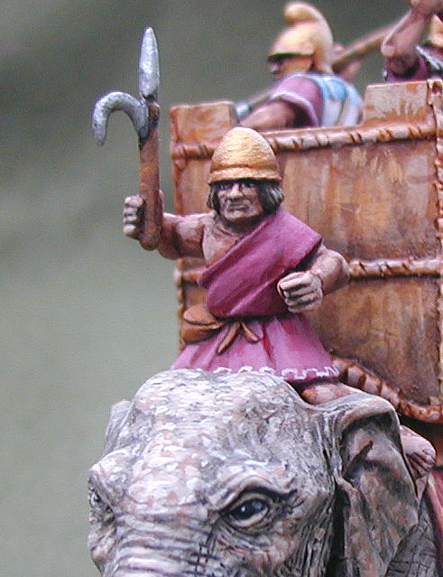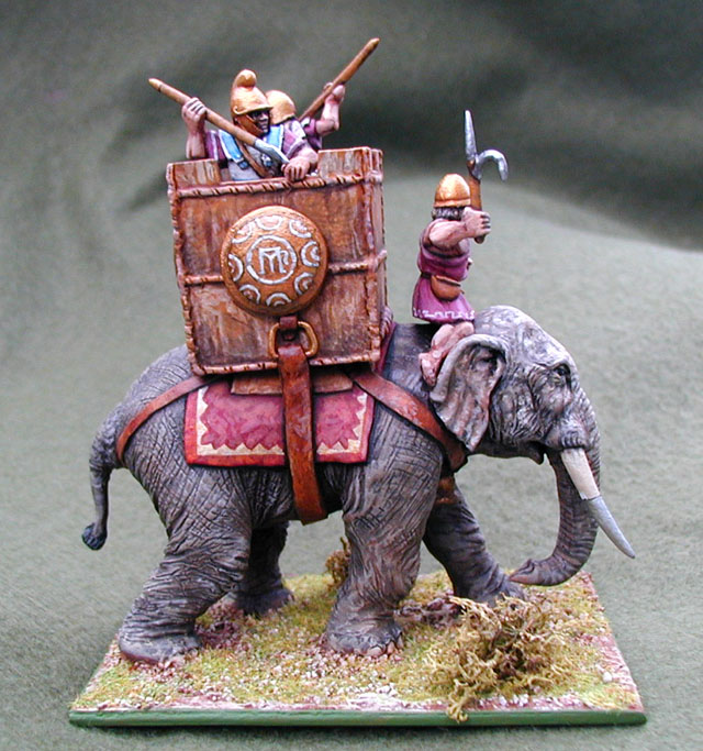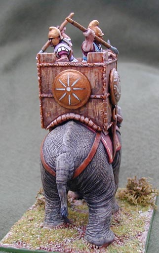 The Vendel elephant is a very large resin sculpt. It certainly is a nice piece when finished, but I do prefer the animation of their later elephant models. I added a Foundry crewman to the Vendel crewman, because I wanted two javelinmen as depicted on the plate, instead of a pikeman and archer. The mahout's goad had to be hand crafted. I also added the bell with green-glop.... it's a bit thick, but at least it's in the shade! Also the straps on the beast and tower connection needed some work to look convincing. Again green-glop and some metal bits solved the issues. Shields were added and painted with a design gleaned from Duncan Head's "Armies of the Macedonian and Punic Wars" that is a shield device shown on Epirote coins, which is Pyrrhus' own moniker.