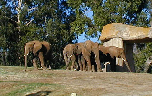 These are the African elephants at the Wild Animal Park in San Diego. I witnessed a wild event one day. The calf was playing nearby us close to edge of the fence. Some deer hopped by and set the baby into a wild panic trumpeting up the hill. All hell broke loose. The elephants all began running from all over the enclosure towards the calf. They were really pissed cause you could hear them grunting and then trumpeting! The ground literally shook as they converged in their defensive stance. Some of them were looking right at me and all I could say was gibberish.... in fact it all happened so fast that I was only able to take this onephoto... but the adrenalin was pumping! Note they have the baby hidden from view!