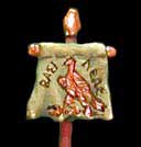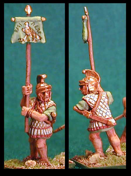 The standard bearer wears a quilted corselet cut like a spolas or linothorax with ptruges (fingers). This may be the style of armor copied by the Greek general Iphicrates and introduced to Greece before the item of Alexander. It is unknown how common this armor type was as this kind of material rarely survives in archeological digs and there is very paltry visual evidence as well. The helmet is a typical high crested version of the Ascalon style, popular in both the Ptolemaic and Seleucid armies. The banner design is taken from a coin, it appears that the eagle is a typical Ptolemaic emblem.
