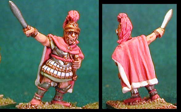 The officer is typical of a Hellenistic general, he has iron armor, silvered, with gold tassels. The Romans copied the Hellenistic generals' appearance, that's why folks that watch your games will think your officers are Romans! This figure could be crafty Sosibios himself lending extra leadership to the levy phalanx at Raphia. This is a nice figure, albeit he appears a bit stocky, but then some of these iron corselets were made to withstand a shot from a bolt shooter in a siege. The cloak could also be green, if a high ranker like Sosibios, probably purple.