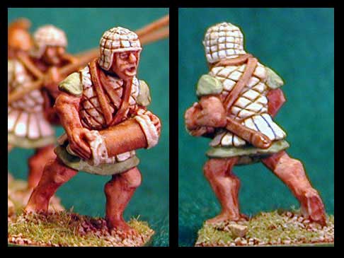 The central figure here is a regular phalangite of the settled Macedonian population, or a mercenary, or may just as well represent the machimoi. The photo at the top of the page shows the style of armor called the kotthubos and is illustrated in AMPW figure 38. Few models in 28mm capture this high waited style of corselet as well as this 1st Corps figure. I would only wish for a variant with greaves, and or boots as well, that would make this figure quite useful. Congrats on a nice new entry to the Successor ranks, hopefully the army lists will be out by the time the armies are collected and painted :) I look forward to more figures in this range, hopefully phalangites with raised pikes for variety, and maybe some cavalry, Arab, and Nubian auxiliaries to fill out the Galatians and other mercenaries that can be gathered form other manufacturers to fill out a Ptolemaic army.