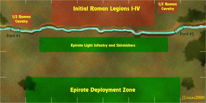 The Epirote player may set up as normal in their deployment zone, however all skirmishers and light infantry are screening the river bank and must be set up within the Light infantry and skirmishers box.